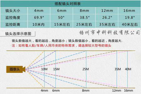 2、監(jiān)控?cái)z像頭的鏡頭毫米數(shù)值越小,看的越近(有效范圍),但是攝像頭的有效角度就越大或?qū)?,角度大距離攝像頭近的東西也能很好的覆蓋,并且也能看清楚,反之看遠(yuǎn)了就不清晰。  所以一般店內(nèi)或超市,常用的都是4mm 6mm居多,特殊情況可以使用毫米數(shù)大的,這些都是視情況而定。